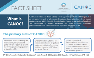 This week, we are sharing a fact sheet on the Canadian Observational Cohort (CANOC): Canada’s largest multi-province study of people living with HIV on antiretroviral therapy. CANOC is an integrated network of all registered treatment information from eleven cohort databases across British Columbia, Ontario, Quebec, Saskatchewan and Newfoundland. This collaboration of national researchers and select databases establishes policy-relevant studies in HIV therapeutics, population and public health.