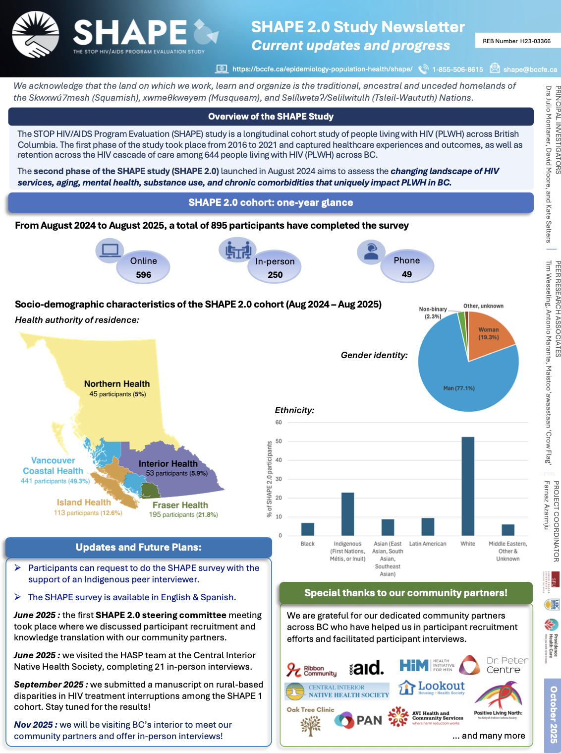 The ‘first phase’ of the SHAPE study wrapped in September 2021, which captured the experiences of 644 people living with HIV across BC. We continue to share research findings from SHAPE, with both academic and community audiences, and have brought back our findings to partnering sites across the province. To read more about the first wave of SHAPE, please find our publications and knowledge translation outputs at the bottom of this page under Publications, Posters, and Presentations or by going to https://bccfe.ca/epidemiology-population-health/shape/#posters-and-presentations.