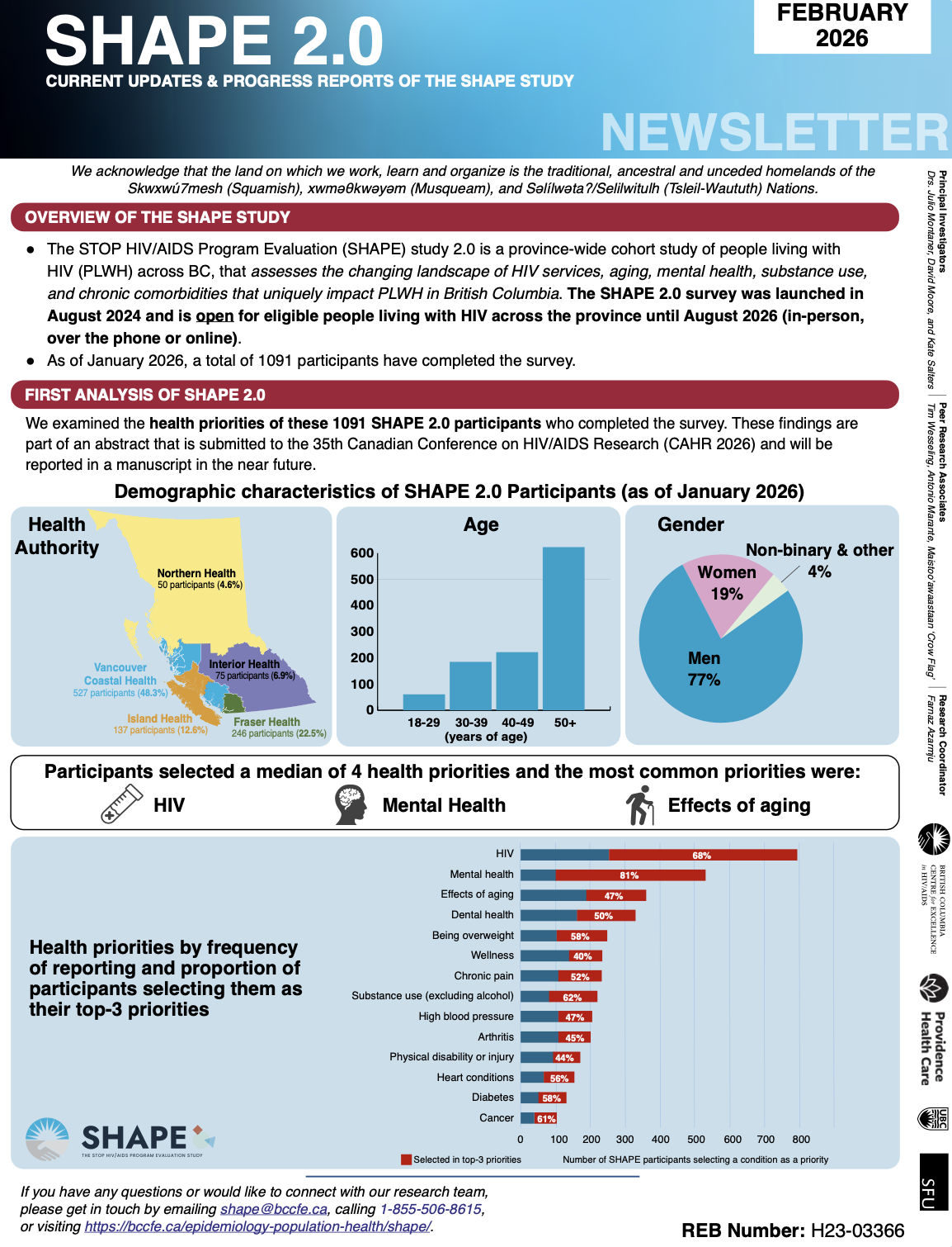 In 2024 investigators at the BC CfE and all health authorities in BC are launching a new phase of the SHAPE study (SHAPE 2.0). Through community engagement and guidance from the SHAPE steering committee, we have heard that the priorities, concerns and realities of PLWH across BC has dramatically changed since the start of the provincial STOP HIV/AIDS® strategy more than a decade ago. While HIV treatment has had clear success in improving HIV-related morbidity and mortality, there is an ongoing need to understand the quality of healthcare, as well as the health priorities and experiences of PLWH in order to adapt and improve our health services. The changing landscape of HIV services, aging, mental health and substance use, and chronic comorbidities that are uniquely impacting PLWH is the focus of this new phase of the SHAPE study.